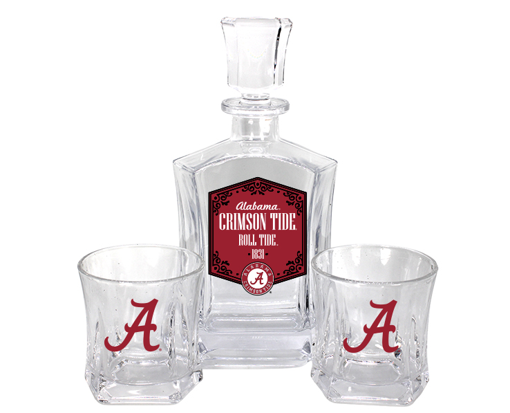 Officially Licensed Product. Alabama Crimson Tide 25oz decanter featuring a stylish vintage label, with 2 matching 10oz rocks glasses featuring team logo