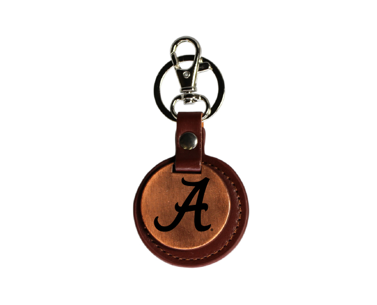 Officially Licensed Product. Vegan leather fob keychain with copper colored disk featuring Alabama Crimson Tide logo in black
