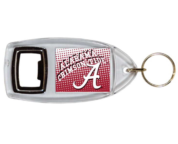 Officially Licensed Product. Alabama Crimson Tide Show your team spirit with this multifunction keychain and bottle opener. Made from sturdy metal and acrylic. 12 in an inner pack, 144 per case.