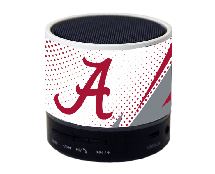 Officially Licensed Product. Alabama Crimson Tide has full wrap around graphics. 3 watts of power that can be linked with other Gameday Outfitters bluetooth speakers for jaw dropping audio performance. Bluetooth connectivity up to 30 feet. 5 hours of play time and 2 hours to fully charge.
