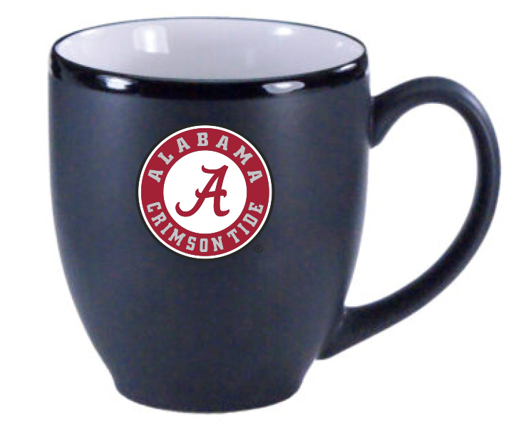 Officially Licensed Product. Alabama Crimson Tide 16oz bistro-style ceramic mug with matte black exterior and C-handle, and team color inside.