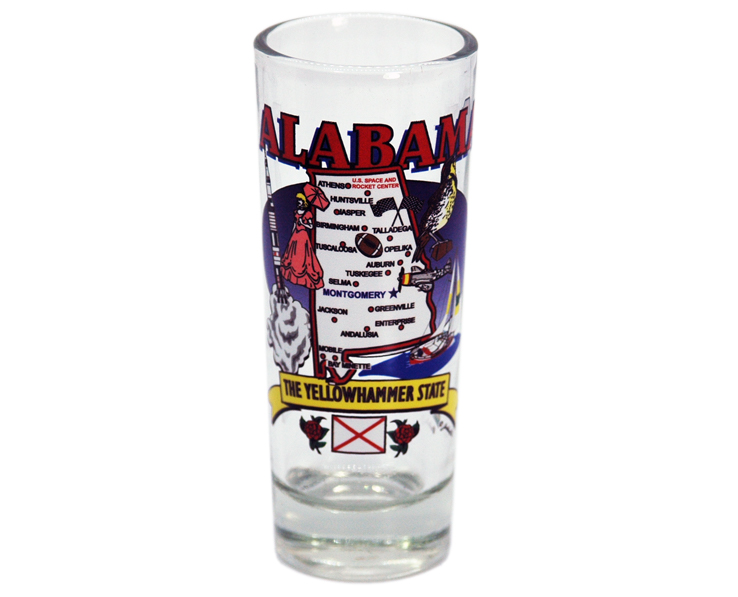 Collectible Alabama souvenir 2 ounce glass shooter with classic state outline design. Best seller! 12 pieces in an inner 144 per case.