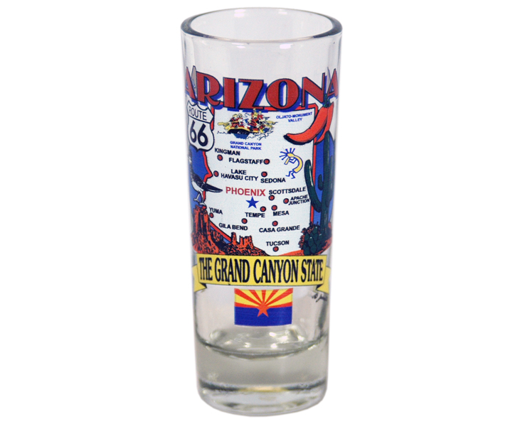 Collectible Arizona souvenir 2 ounce glass shooter with classic state outline design. Best seller! 12 pieces in an inner 144 per case.