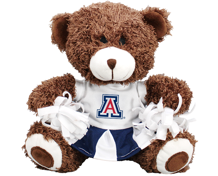 Officially Licensed Product. Arizona Wildcats soft plush teddy in cheerleader dress with embroidered patch or vinyl decal team logo. 12 pieces in an inner pack, 120 per case.
