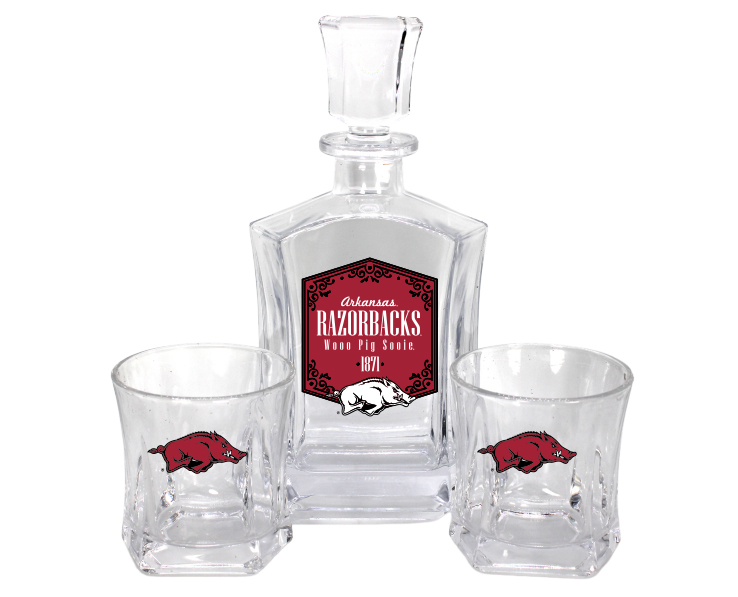 Officially Licensed Product. Arkansas Razorbacks 25oz decanter featuring a stylish vintage label, with 2 matching 10oz rocks glasses featuring team logo
