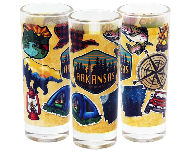Collectible Arkansas souvenir 2 ounce glass shooter with full wrap design. 12 pieces in an inner 144 per case.