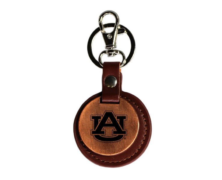 Officially Licensed Product. Vegan leather fob keychain with copper colored disk featuring Auburn Tigers logo in black