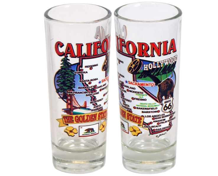 Collectible California souvenir 2 ounce glass shooter with classic state outline design. Best seller! 12 pieces in an inner 144 per case.