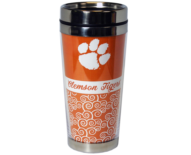 Officially Licensed Product. Clemson Tigers Best seller! Double wall 14 ounce travel mug with stainless steel inner and plastic outer shell. Individually packaged in white box. 6 pieces in an inner pack 24 per case.