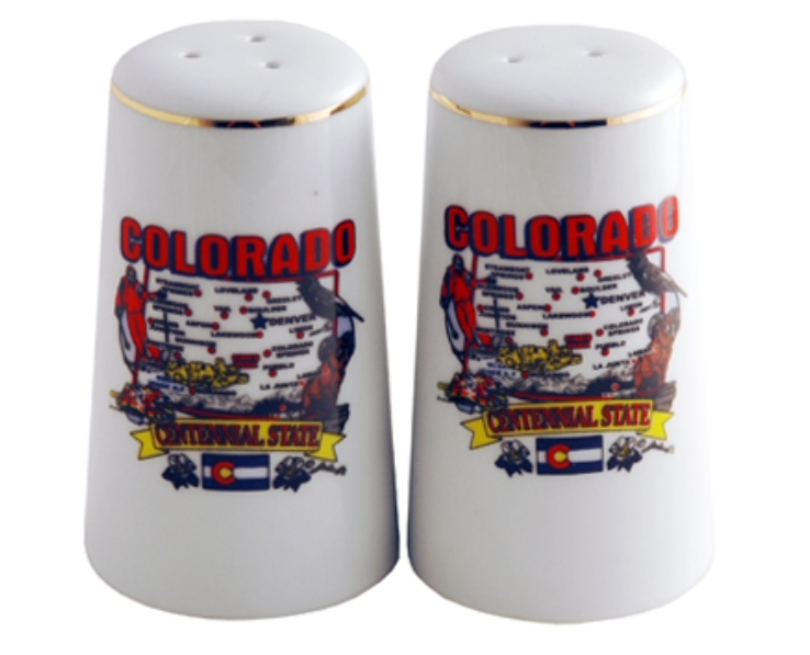 Collectible Colorado souvenir Ceramic Salt and Pepper set featuring best selling state map art. 6 sets in an inner pack 120 per case.