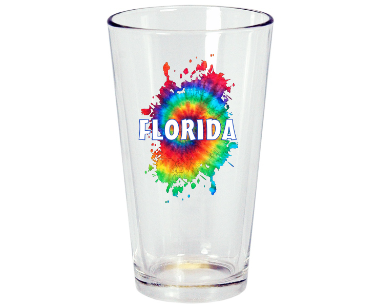 Collectible Florida souvenir Pint glass with bright fun tie dye graphic. 12 pieces per case.