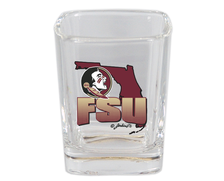 Officially Licensed Product. Florida State Seminoles 2 ounce square collector’s glass. Features state map and mascot design. 12 pieces in an inner 144 per case.