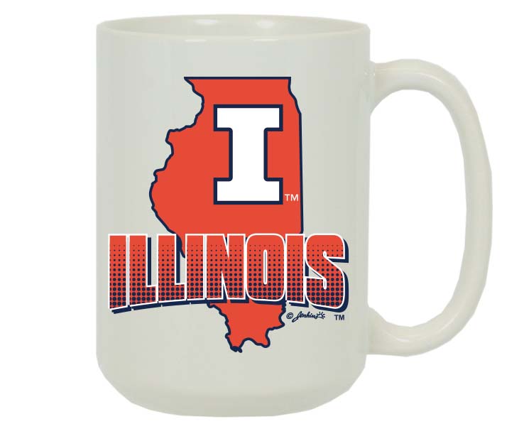 Officially Licensed Product. Illinois Fighting Illini. This 15 ounce ceramic mug is a cool combination of team spirit and state pride with the map and logo graphic. 6 pieces in an inner pack 36 per case.