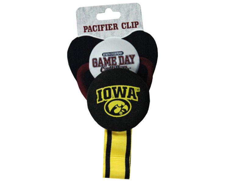 Officially Licensed Product. Iowa Hawkeyes Infant pacifier clip.12 pieces in an inner pack. 144 per case.