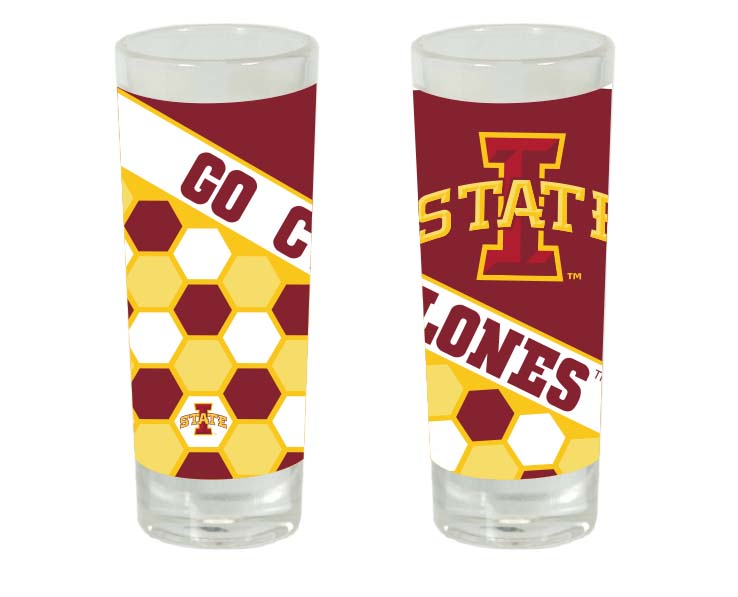 Officially Licensed Product. Iowa State Cyclones 2 ounce glass shooter with our all new honeycomb design featuring team slogan and logo. 12 pieces in an inner 144 per case.