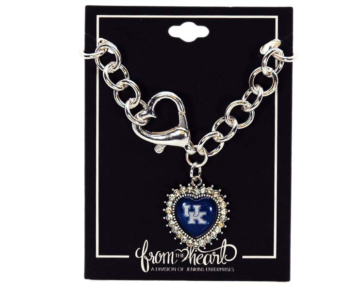 Officially Licensed Product. Kentucky Wildcats Show your team pride with this heart shaped logo charm bracelet with studded outline. Carded for easy display. 12 pieces in an inner pack 144 per case.