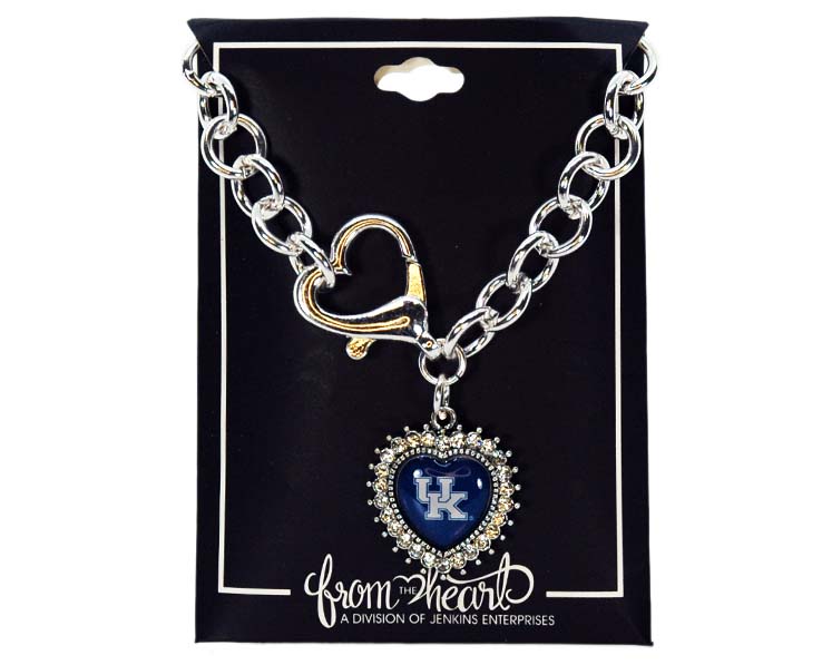 Officially Licensed Product. Kentucky Wildcats Show your team pride with this heart shaped logo charm necklace with studded outline. Carded for easy display. 12 pieces in an inner pack 144 per case.