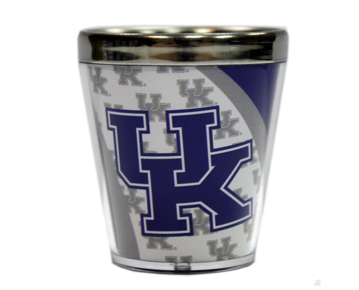 Officially Licensed Product. Kentucky Wildcats 1.5 ounce collector’s glass with stainless steel inner and team color plastic outer. 12 pieces in an inner 144 per case.
