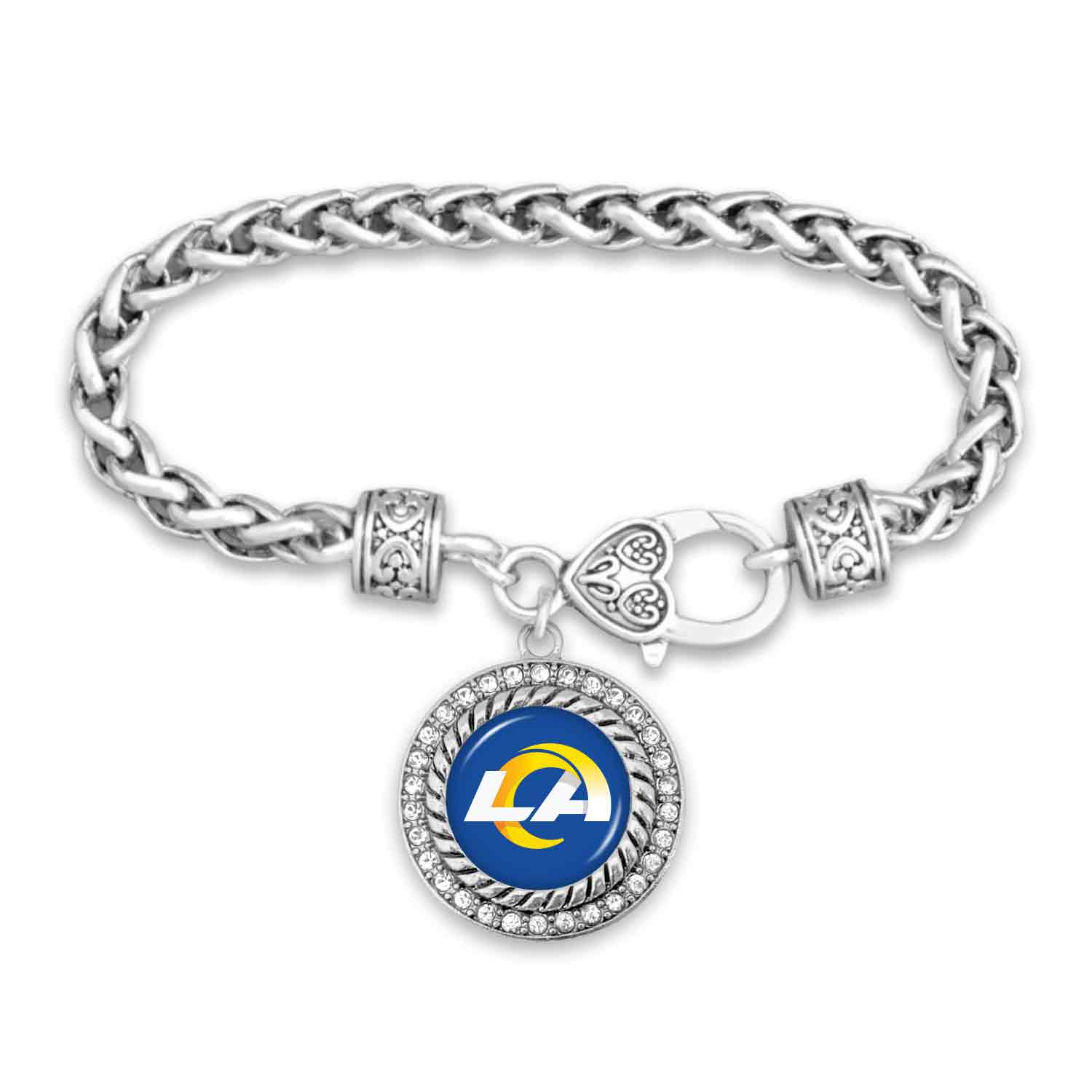 Officially Licensed Product. Get your Los Angeles Rams spirit on with stackable charm bracelets! Our Allie design features a braided chain band, designer clasp, and bedazzled 1 inch domed charm. Brand: Mojo Licensing