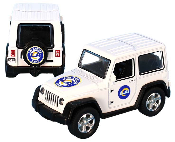 Officially Licensed Product. Los Angeles Rams toy ATV with pull-back action. This die cast toy truck comes decorated with full color decals on the hood, door panels, and spare tire. Suitable for ages 12 and up. Brand: Mojo Licensing