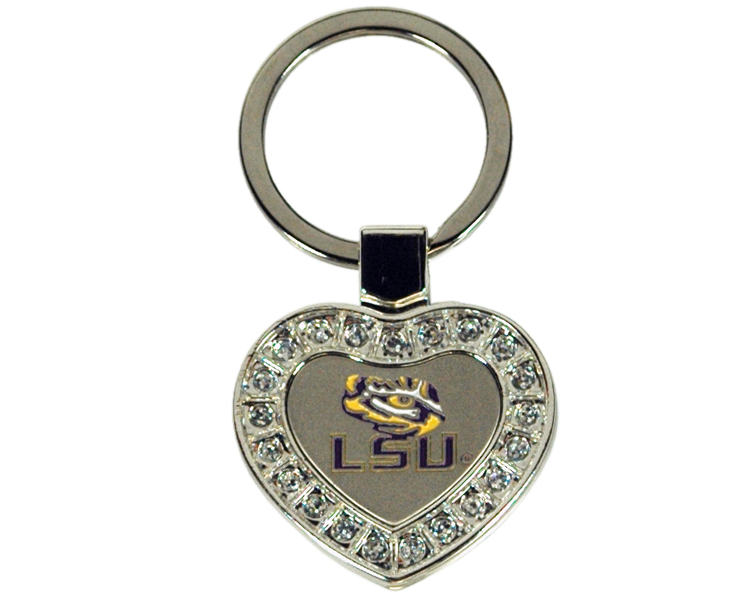 Officially Licensed Product. LSU Tigers Great heart shaped keychain with rhinestone edging, Engraved with enamel ink fill. 12 pieces in inner pack 144 per case.