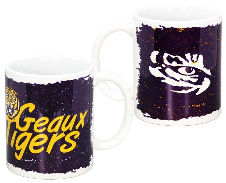 Officially Licensed Product. LSU Tigers 11 ounce ceramic mug printed with our all new rugged torn design featuring team name and mascot. 6 pieces in an inner pack 36 per case.