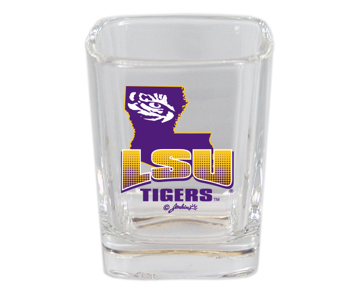 Officially Licensed Product. LSU Tigers 2 ounce square collector’s glass. Features state map and mascot design. 12 pieces in an inner 144 per case.