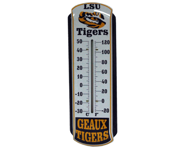 Officially Licensed Product. LSU Tigers Perfect addition to any patio or mancave. Pressed tin embossed thermometer. Comes on blister card for easy display. 6 pieces in an inner 144 per case.