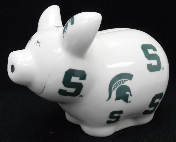 Officially Licensed Product. Michigan State Spartans Ceramic bank. Rubber stopper to easily remove money. 6 pieces in inner pack 36 per case.