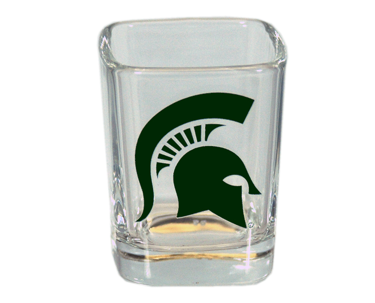 Officially Licensed Product. Michigan State Spartans 2 ounce square collector’s glass. Features state map and mascot design. 12 pieces in an inner 144 per case.