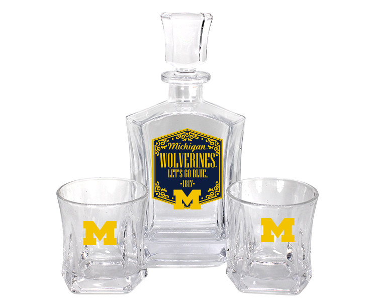 Officially Licensed Product. Michigan Wolverines 25oz decanter featuring a stylish vintage label, with 2 matching 10oz rocks glasses featuring team logo