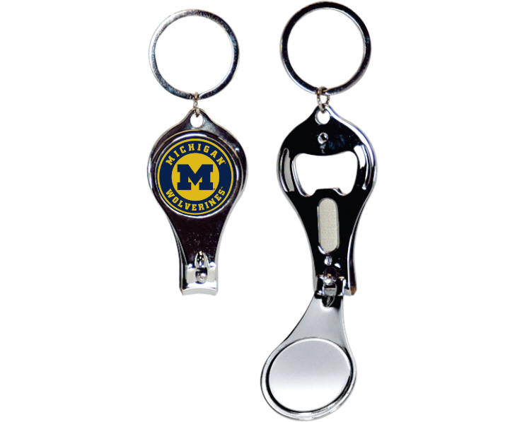 Officially Licensed Product. Michigan Wolverines A best seller! The three in one keychain features use as a keychain, bottle opener and nailclipper!12 pieces in inner pack 144 per case.