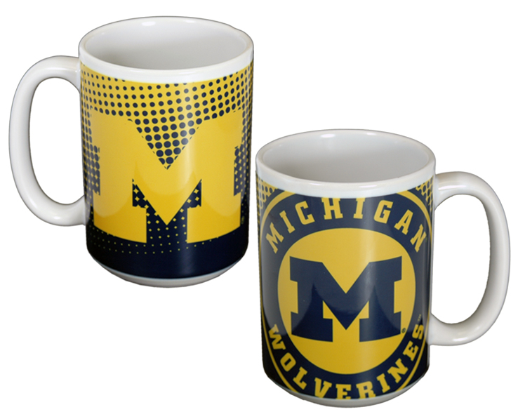 Officially Licensed Product. Michigan Wolverines Full color wrap around art on a 15 ounce ceramic mug. 6 pieces in an inner pack 36 per case.