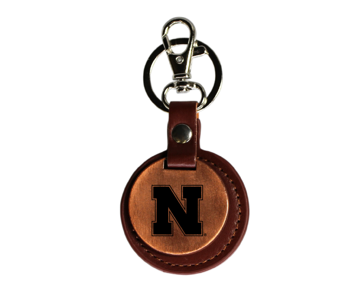 Officially Licensed Product. Vegan leather fob keychain with copper colored disk featuring Nebraska Cornhuskers logo in black
