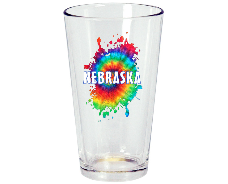 Collectible Nebraska souvenir Pint glass with bright fun tie dye graphic. 12 pieces per case.