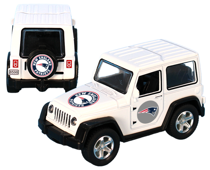 Officially Licensed Product. New England Patriots toy ATV with pull-back action. This die cast toy truck comes decorated with full color decals on the hood, door panels, and spare tire. Suitable for ages 12 and up. Brand: Mojo Licensing