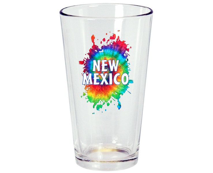 Collectible New Mexico souvenir Pint glass with bright fun tie dye graphic. 12 pieces per case.