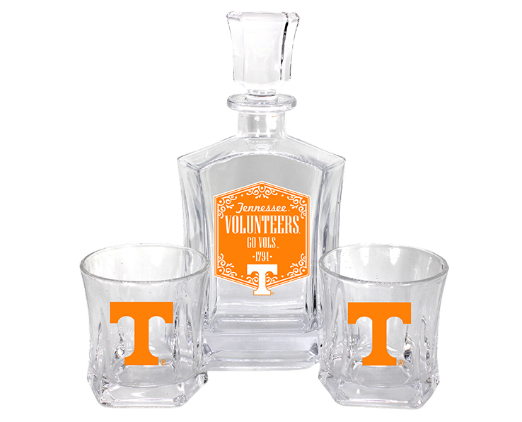 Officially Licensed Product. Tennessee Volunteers 25oz decanter featuring a stylish vintage label, with 2 matching 10oz rocks glasses featuring team logo