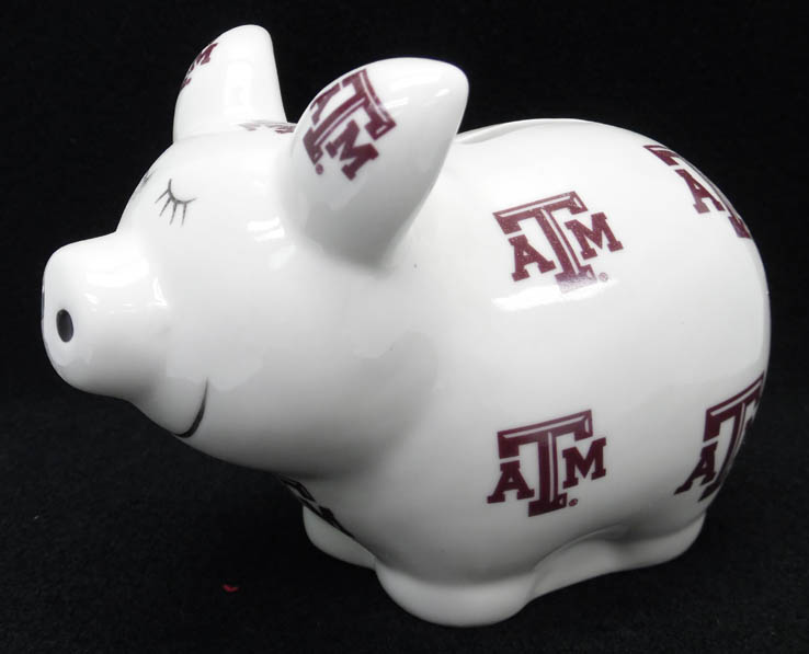 Officially Licensed Product. Texas A&M Aggies Ceramic bank. Rubber stopper to easily remove money. 6 pieces in inner pack 36 per case.
