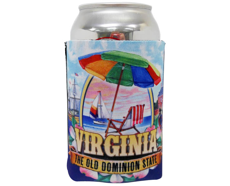Collectible Virginia souvenir Collapsible neoprene pocket can koolie. Fits most 12 ounce cans. Folds flat for easy storage or to slip in a pocket. Comes with a clip strip for easy display. 12 pieces in inner pack 144 per case.