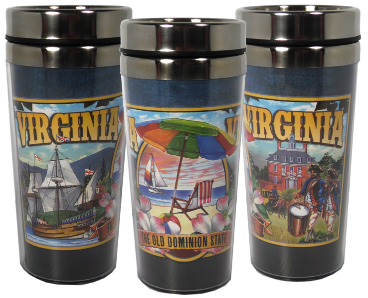 Collectible Virginia souvenir Best seller! Double wall 14 ounce travel mug with stainless steel inner and plastic outer shell. Individually packaged in white box. 6 pieces in an inner pack 24 per case.