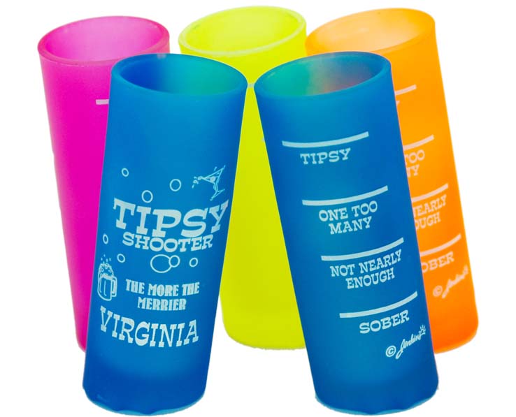 Collectible Virginia souvenir Colorful 2 ounce frosted glass tipsy shooter. 4 assorted colors per dozen. 12 pieces in an inner 144 per case.