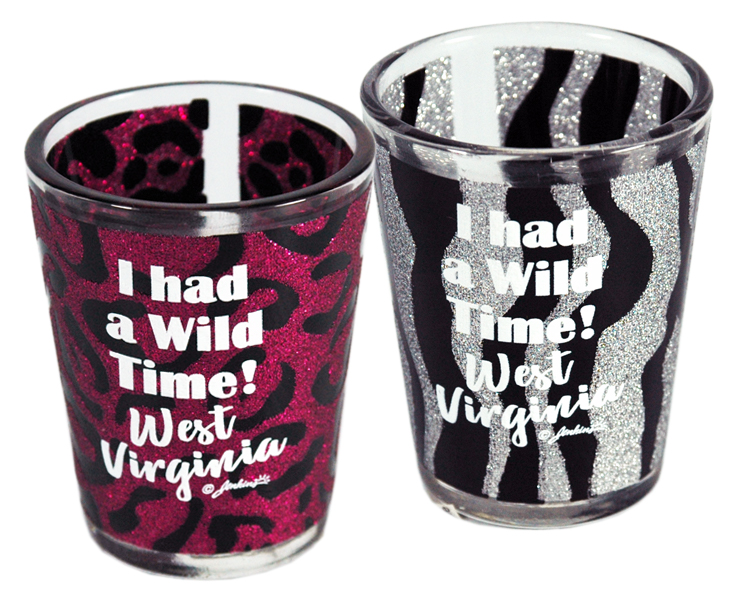 Collectible West Virginia souvenir Have a ?wild time? with these 1.5 ounce wild animal print glitter shots. Two assorted color/prints per dozen. 12 pieces in an inner 144 per case.