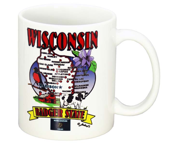 Collectible Wisconsin souvenir 11 ounce ceramic mug has classic state map art featuring state cities and attractions. Always a best seller! 6 pieces in an inner pack 36 per case.