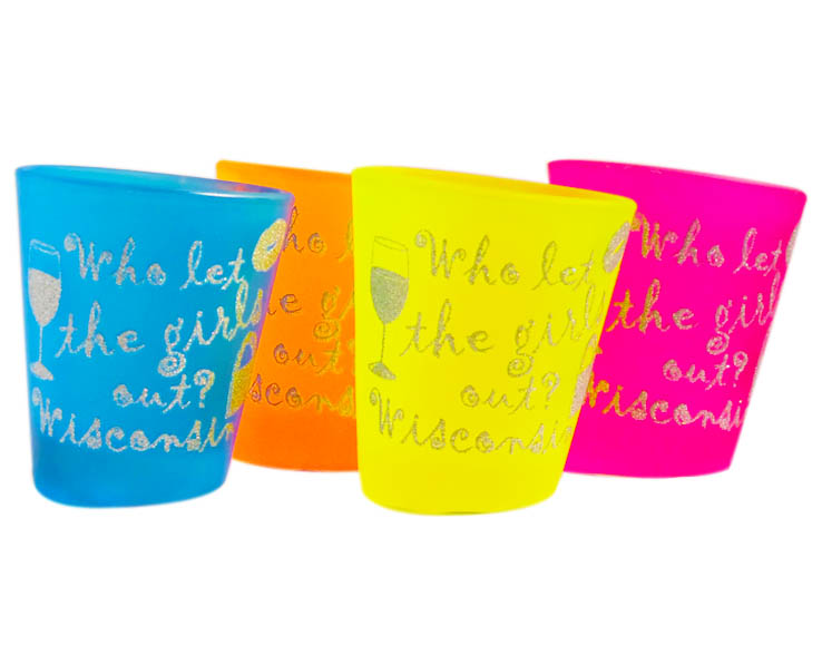 Collectible Wisconsin souvenir 1.5 ounce colorful frosted glass tipsy shotglass. 4 assorted colors per dozen. 12 pieces in an inner 144 per case.